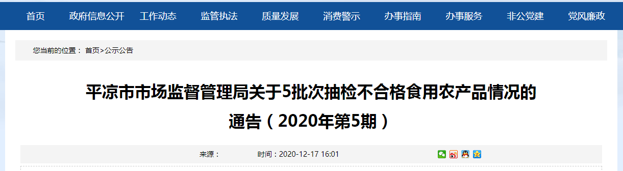 中國質(zhì)量新聞網(wǎng)訊 (記者 徐遠(yuǎn)官) 12月17日,甘肅省平?jīng)鍪惺袌?chǎng)監(jiān)督管理局網(wǎng)站發(fā)布通告稱,2020年11月份,平?jīng)鍪惺袌?chǎng)監(jiān)督管理局組織對(duì)食用農(nóng)產(chǎn)品開展監(jiān)督抽檢,共抽檢食用農(nóng)產(chǎn)品45批次,所檢項(xiàng)目檢驗(yàn)合格40批次,不合格5批次,檢出農(nóng)藥殘留超標(biāo)、違規(guī)使用農(nóng)藥問題。