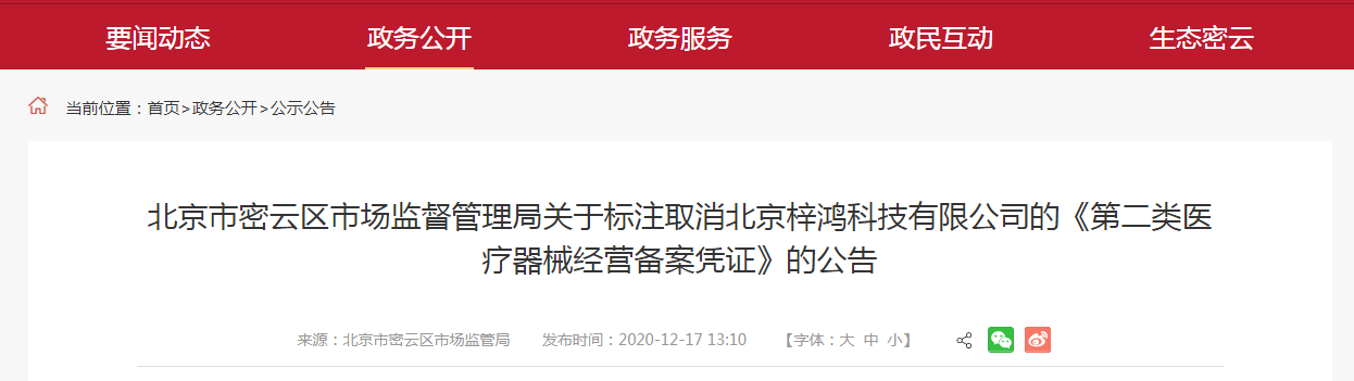 中國質(zhì)量新聞網(wǎng)訊 近日,北京市密云區(qū)市場監(jiān)督管理局發(fā)布關(guān)于標注取消北京梓鴻科技有限公司的《第二類醫(yī)療器械經(jīng)營備案憑證》的公告。