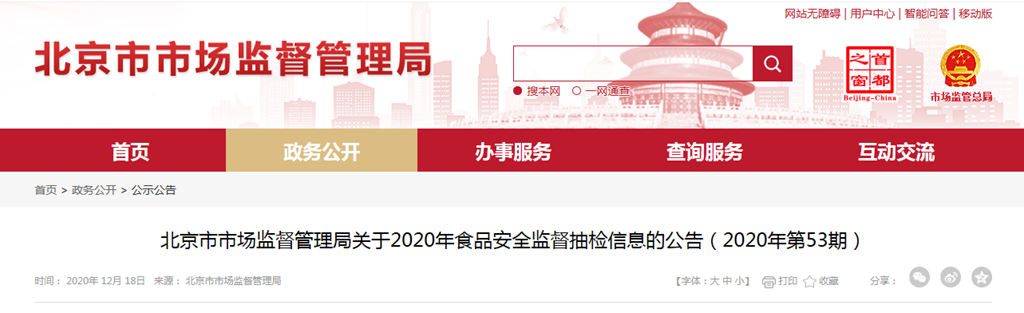 中國質(zhì)量新聞網(wǎng)訊 2020年12月18日,北京市市場(chǎng)監(jiān)督管理局網(wǎng)站發(fā)布《北京市市場(chǎng)監(jiān)督管理局關(guān)于2020年食品安全監(jiān)督抽檢信息的公告(2020年第53期)》。該公告顯示,根據(jù)《中華人民共和國食品安全法》等法律法規(guī)要求,以及北京市食品安全監(jiān)督抽檢計(jì)劃和相應(yīng)的抽檢細(xì)則,北京市市場(chǎng)監(jiān)管局組織抽檢了22類食品2490批次樣品。根據(jù)食品安全國家標(biāo)準(zhǔn)及國家有關(guān)規(guī)定檢驗(yàn)和判定,其中合格樣品2472批次,不合格樣品18批次。針對(duì)在食品安全監(jiān)督抽檢中發(fā)現(xiàn)的不合格食品,北京市市場(chǎng)監(jiān)管理局已要求食品生產(chǎn)經(jīng)營者所在地市場(chǎng)監(jiān)管部門依法調(diào)查處理,涉及外埠的已通報(bào)當(dāng)?shù)厥袌?chǎng)監(jiān)管部門。