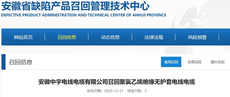 中國質(zhì)量新聞網(wǎng)訊 據(jù)安徽省缺陷產(chǎn)品召回管理技術(shù)中心網(wǎng)站2020年12月21日消息,日前,安徽中宇電線電纜有限公司按照《消費品召回管理暫行規(guī)定》的要求,向安徽省市場監(jiān)督管理局、亳州市市場監(jiān)督管理局備案了召回計劃,決定自即日起,召回2020年9月22日生產(chǎn)的型號60227IEC01(BV) 450/750V 1×2.5mm2聚氯乙烯絕緣無護套電線電纜(批號20200922),共計70袋(7000米)。