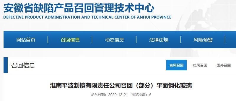 中國質(zhì)量新聞網(wǎng)訊 據(jù)安徽省缺陷產(chǎn)品召回管理技術(shù)中心網(wǎng)站2020年12月21日消息,日前,淮南平波制鏡有限責(zé)任公司按照《消費(fèi)品召回管理暫行規(guī)定》的要求,向安徽省市場監(jiān)督管理局、淮南市市場監(jiān)督管理局報(bào)告了召回計(jì)劃,將自即起,召回2020年11月18日生產(chǎn)的型號(hào)為1000*800 、厚度5mm的平面鋼化玻璃(裝飾)共計(jì)80塊。