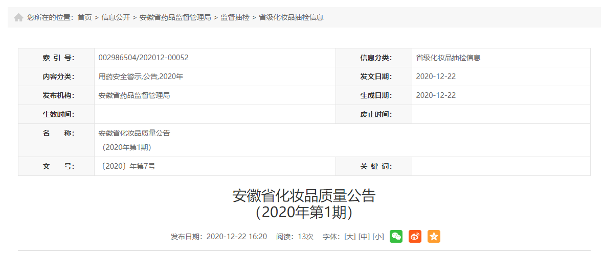 安徽省化妝品質(zhì)量抽查檢驗(yàn)信息