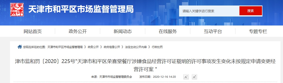 天津市和平區(qū)榮喜堂餐廳涉嫌食品經(jīng)營許可證載明的許可事項發(fā)生變化未按規(guī)定申請變更經(jīng)營許可案 | 天津市和平區(qū)榮喜堂餐廳 | 92120101MA05RPXN5M | 92120101MA05RPXN5M | 高程 | 津市監(jiān)和罰〔2020〕225號 | 當事人食品經(jīng)營許可證載明的許可事項發(fā)生變化,未按規(guī)定申請變更 | 警告 | 《食品經(jīng)營許可管理辦法》第四十九條 | 無 | 天津市和平區(qū)市場監(jiān)督管理局 | 20200918 |