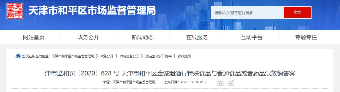 天津市和平區(qū)金誠(chéng)煙酒行特殊食品與普通食品或者藥品混放銷售案 | 天津市和平區(qū)金誠(chéng)煙酒行 | 92120101MA069XMK57 | 92120101MA069XMK57 | 劉顯麗 | ?津市監(jiān)和罰〔2020〕628 號(hào)? | 經(jīng)核查,當(dāng)事人涉嫌保健食品與普通食品混放銷售行為屬實(shí)。經(jīng)責(zé)令改正,當(dāng)事人已將其保健食品設(shè)置專區(qū)銷售。 | 警告 | 《中華人民共和國(guó)食品安全法實(shí)施條例》第六十九條第一款第(五)項(xiàng) | 主動(dòng)履行 | 天津市和平區(qū)市場(chǎng)監(jiān)督管理局 | 2020年12月16日 |