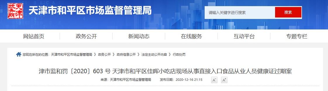 天津市和平區(qū)佳暉小吃店現(xiàn)場(chǎng)從事直接入口食品從業(yè)人員健康證過(guò)期案 | 天津市和平區(qū)佳暉小吃店 | 92120101MA06KBDC21 | 92120101MA06KBDC21 | 胡月 | 津市監(jiān)和罰〔20 號(hào)??20〕603 | 經(jīng)核查,當(dāng)事人涉嫌有從事直接入口食品從業(yè)人員未辦理健康證明情況屬實(shí)。經(jīng)責(zé)令改正,當(dāng)事人店內(nèi)接觸直接入口食品人員已按照要求辦理了健康證明。 | 警告 | 《中華人民共和國(guó)食品安全法》第一百二十六條第一款第(六)項(xiàng) | 主動(dòng)履行 | 天津市和平區(qū)市場(chǎng)監(jiān)督管理局 | 2020年12月16日 |