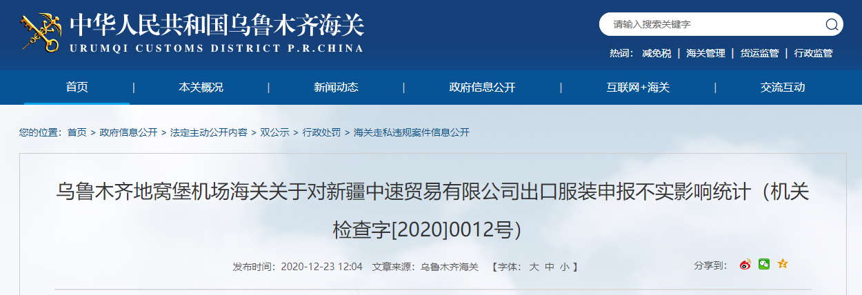 出口服裝申報不實 新疆中速貿易有限公司被罰