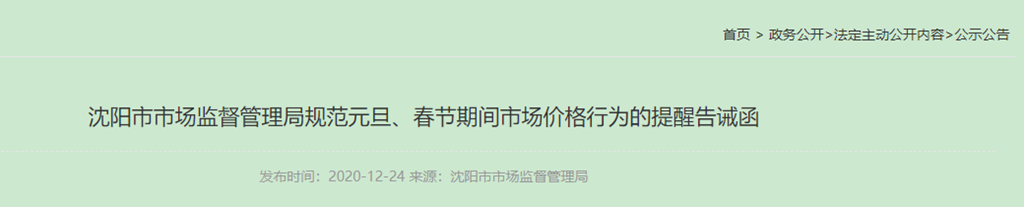 沈陽市市場監(jiān)督管理局規(guī)范元旦、春節(jié)期間市場價格行為的提醒告誡函