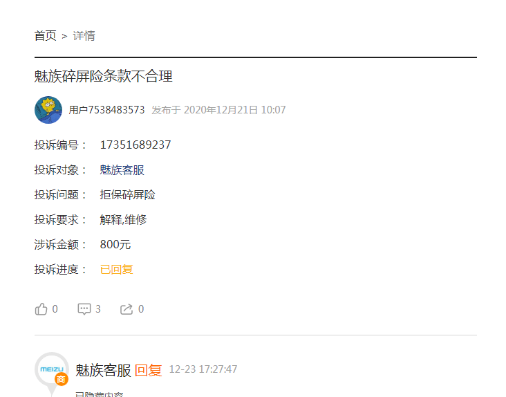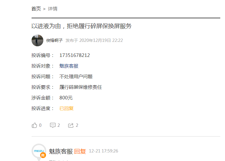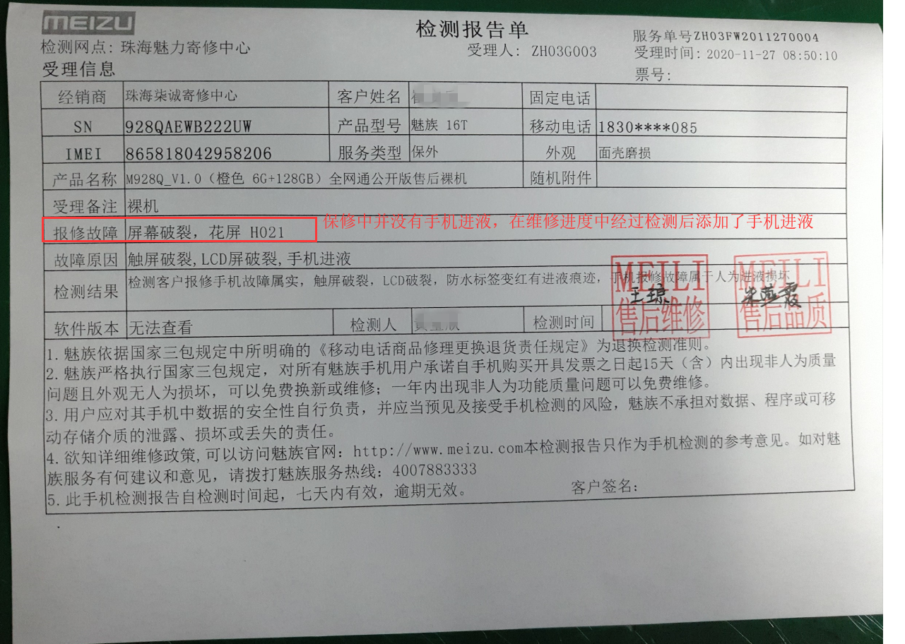還有消費(fèi)者投訴,購(gòu)買魅族16x手機(jī)一部后于魅族官方網(wǎng)站購(gòu)買魅族碎屏險(xiǎn),手機(jī)發(fā)生跌落導(dǎo)致手機(jī)顯示異常,花屏,隨后黑屏,隨即于官網(wǎng)申請(qǐng)維修換屏。寄出后聯(lián)系魅族客服詢問手機(jī)維修進(jìn)度,被告知手機(jī)進(jìn)液,要求消費(fèi)者打款自費(fèi)維修。魅族出具的檢修報(bào)告顯示:LCD屏破裂,手機(jī)進(jìn)液。對(duì)此,投訴者不認(rèn)可。他稱手機(jī)寄出前一切正常,請(qǐng)魅族拿出證據(jù)證明,手機(jī)確有進(jìn)液且為本人所為。如果不能,請(qǐng)魅族履行碎屏險(xiǎn)維修責(zé)任。