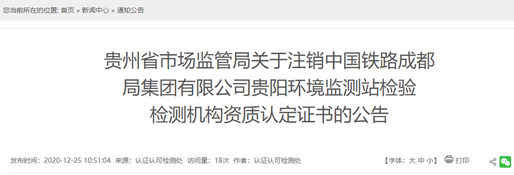 貴州省市場(chǎng)監(jiān)管局關(guān)于注銷中國(guó)鐵路成都局集團(tuán)有限公司貴陽(yáng)環(huán)境監(jiān)測(cè)站檢驗(yàn)檢測(cè)機(jī)構(gòu)資質(zhì)認(rèn)定證書的公告