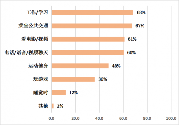 在佩戴時(shí)長(zhǎng)方面,52%受訪者每天佩戴耳機(jī)時(shí)長(zhǎng)在1-3小時(shí)之間;應(yīng)用場(chǎng)景較多的則為工作/學(xué)習(xí)時(shí)、乘坐公共交通時(shí)、看電影/視頻時(shí)以及聊天時(shí),均超過(guò)60%。