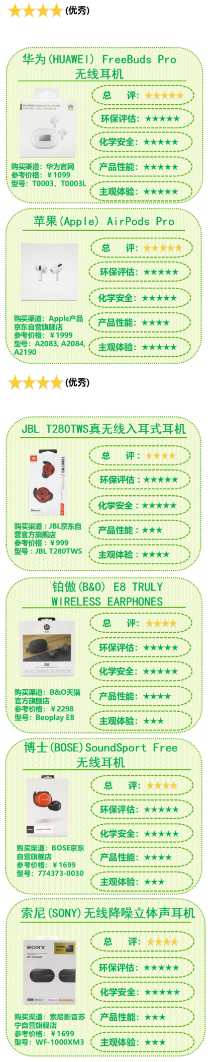 ?本次共計(jì)購(gòu)樣12款,按零售參考價(jià)分為600元以上6款和600元以下6款,4款樣品綜合評(píng)價(jià)表現(xiàn)卓越;其中600元以上款,華為(HUAWEI)FreeBuds Pro 無(wú)線耳機(jī)和蘋(píng)果(Apple)AirPods Pro 樣品獲評(píng)5星;600元以下款,歐珀(OPPO) Enco W51真無(wú)線耳機(jī)和維沃(Vivo) TWS Neo真無(wú)線耳機(jī)樣品獲評(píng)五星;