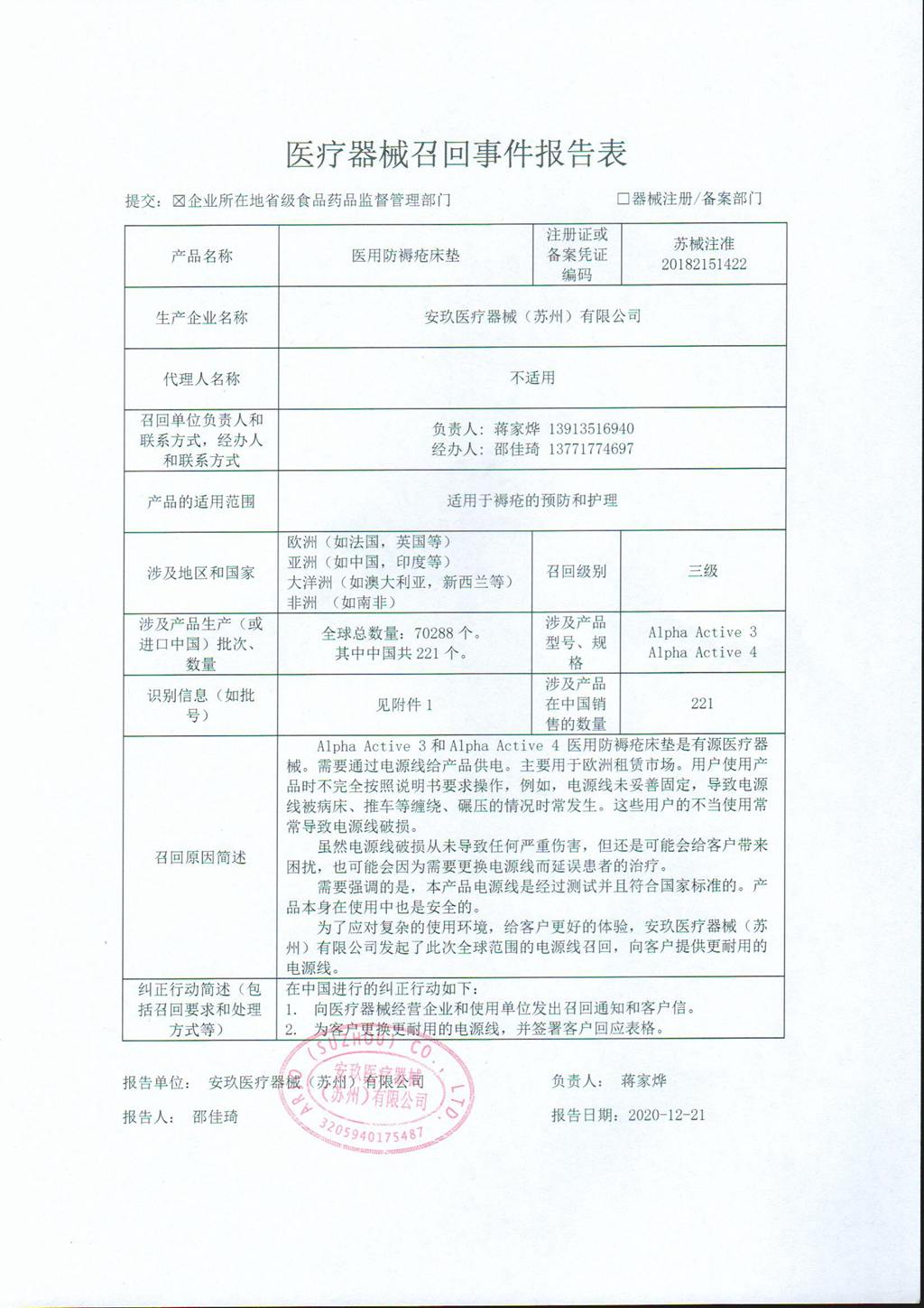安玖醫(yī)療器械(蘇州)有限公司對醫(yī)用防褥瘡床墊主動召回