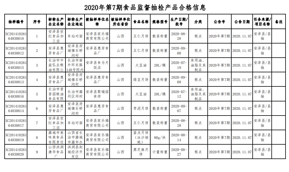 中國質量新聞網訊 (記者陳娟女)據山西省臨汾市安澤縣人民政府網站2020年12月25日消息,安澤縣市場監(jiān)督管理局發(fā)布2020年食品安全監(jiān)督抽檢信息公告(第7期)。本期公布11批次監(jiān)督抽檢結果,涉及食用農產品、糕點、食用油、油脂及其制品、調味品4個大類。根據食品安全國家標準,個別項目不合格,其產品即判定為不合格產品。其中:不合格樣品0批次,合格樣品11批次。