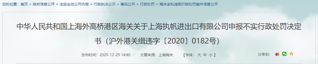 中華人民共和國(guó)上海外高橋港區(qū)海關(guān)關(guān)于上海執(zhí)帆進(jìn)出口有限公司申報(bào)不實(shí)行政處罰決定書(shū)(滬外港關(guān)緝違字〔2020〕0182號(hào))