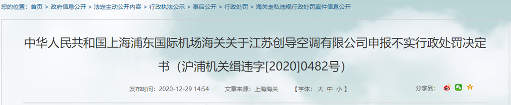 中華人民共和國上海浦東國際機場海關(guān)關(guān)于江蘇創(chuàng)導(dǎo)空調(diào)有限公司申報不實行政處罰決定書(滬浦機關(guān)緝違字[2020]0482號)