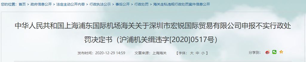 中華人民共和國(guó)上海浦東國(guó)際機(jī)場(chǎng)海關(guān)關(guān)于深圳市宏銳國(guó)際貿(mào)易有限公司申報(bào)不實(shí)行政處罰決定書(滬浦機(jī)關(guān)緝違字[2020]0517號(hào))