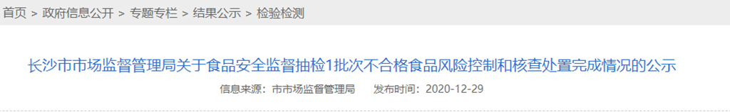 長(zhǎng)沙市市場(chǎng)監(jiān)督管理局關(guān)于食品安全監(jiān)督抽檢1批次不合格食品風(fēng)險(xiǎn)控制和核查處置完成情況的公示