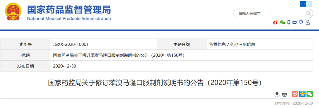 國家藥監(jiān)局關于修訂苯溴馬隆口服制劑說明書的公告(2020年第150號)