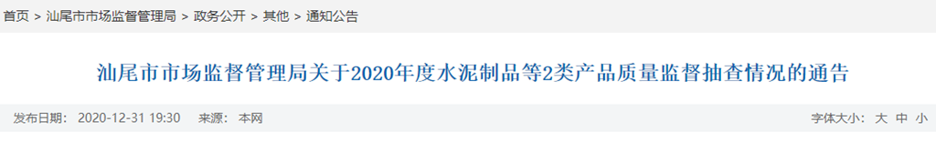 汕尾市市場監(jiān)督管理局關(guān)于2020年度水泥制品等2類產(chǎn)品質(zhì)量監(jiān)督抽查情況的通告