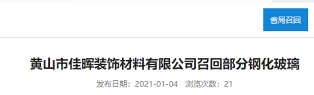 黃山市佳暉裝飾材料有限公司召回部分鋼化玻璃