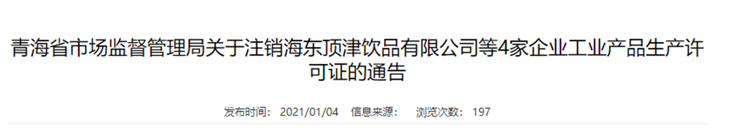 青海省市場監(jiān)督管理局關(guān)于注銷海東頂津飲品有限公司等4家企業(yè)工業(yè)產(chǎn)品生產(chǎn)許可證的通告