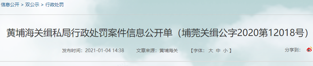黃埔海關緝私局行政處罰案件信息公開單(埔莞關緝公字2020第12018號)