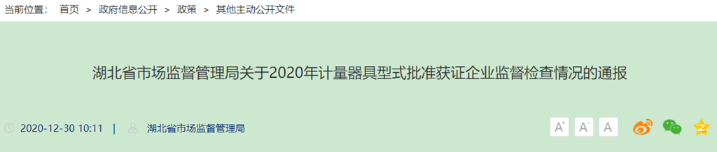 湖北省市場監(jiān)督管理局關于2020年計量器具型式批準獲證企業(yè)監(jiān)督檢查情況的通報