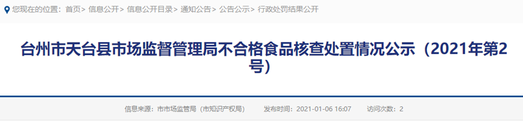 臺州市黃巖區(qū)市場監(jiān)督管理局關(guān)于不合格食品核查處置情況的通告(2021年第2號)