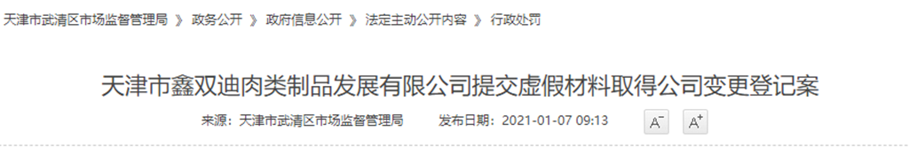 天津市鑫雙迪肉類制品發(fā)展有限公司提交虛假材料取得公司變更登記案