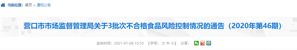 營口市市場監(jiān)督管理局關(guān)于3批次不合格食品風(fēng)險控制情況的通告(2020年第46期)