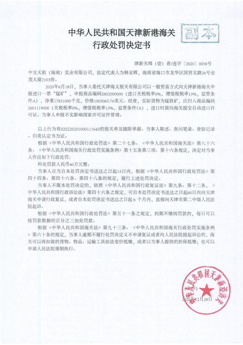 津新港關(guān)緝違字〔2020〕0058號(hào)處罰決定書