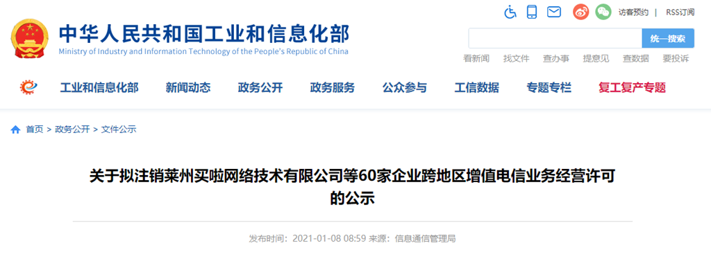 關(guān)于擬注銷萊州買啦網(wǎng)絡(luò)技術(shù)有限公司等60家企業(yè)跨地區(qū)增值電信業(yè)務(wù)經(jīng)營(yíng)許可的公示