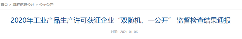 2020年工業(yè)產(chǎn)品生產(chǎn)許可獲證企業(yè)“雙隨機(jī)、一公開”監(jiān)督檢查結(jié)果通報