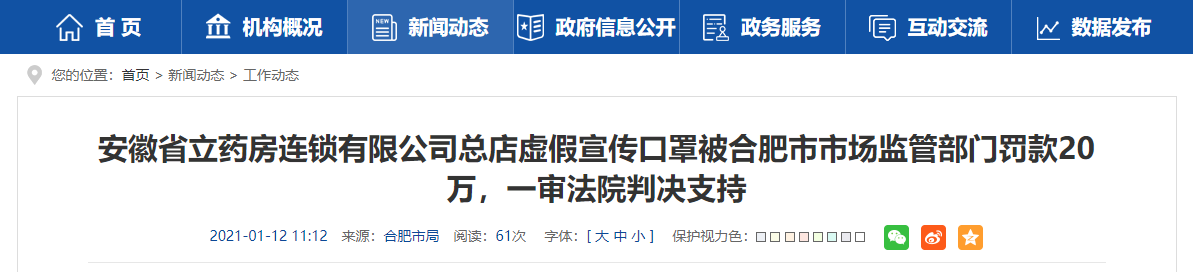 執(zhí)法人員還發(fā)現(xiàn),該商品外包裝標(biāo)注執(zhí)行標(biāo)準(zhǔn)為 :GB2626-2006 KN90,并非標(biāo)注的 “N95 口罩”,該藥店利用價(jià)簽對(duì)商品的功能、質(zhì)量作引人誤解的宣傳,誤導(dǎo)消費(fèi)者,實(shí)施不正當(dāng)競(jìng)爭(zhēng)違法行為,合肥市市場(chǎng)監(jiān)管局依法對(duì)虛假宣傳的口罩采取了扣押措施,后決定對(duì)其予以罰款20萬元。該藥店不服,以合肥市市場(chǎng)監(jiān)管局行政處罰決定違法為由向安徽省市場(chǎng)監(jiān)管局提起行政復(fù)議,省局依法維持了行政處罰決定。2020年9月7日,該藥店以合肥市市場(chǎng)監(jiān)管局和安徽省市場(chǎng)監(jiān)管局為共同被告,向安徽省合肥高新技術(shù)產(chǎn)業(yè)開發(fā)區(qū)人民法院提起行政訴訟,請(qǐng)求撤銷合肥市市場(chǎng)監(jiān)管局的行政處罰決定和安徽省市場(chǎng)監(jiān)管局的行政復(fù)議決定。