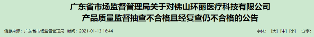 廣東省市場監(jiān)督管理局關(guān)于對佛山環(huán)麗醫(yī)療科技有限公司產(chǎn)品質(zhì)量監(jiān)督抽查不合格且經(jīng)復(fù)查仍不合格的公告