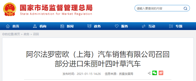 中國質(zhì)量新聞網(wǎng)訊 據(jù)市場監(jiān)管總局網(wǎng)站2021年1月15日消息,日前,阿爾法羅密歐(上海)汽車銷售有限公司根據(jù)《缺陷汽車產(chǎn)品召回管理條例》和《缺陷汽車產(chǎn)品召回管理條例實施辦法》的要求,向國家市場監(jiān)督管理總局備案了召回計劃。自2021年1月18日起,召回部分2020年3月4日至2020年7月31日期間生產(chǎn)的進口2020年款朱麗葉四葉草版車輛,共計4輛。