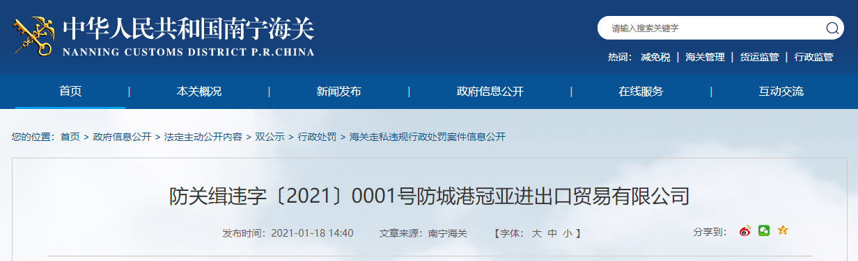 防關(guān)緝違字〔2021〕0001號(hào)防城港冠亞進(jìn)出口貿(mào)易有限公司
