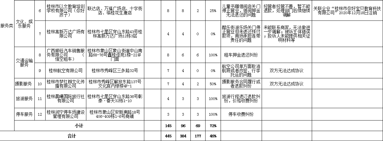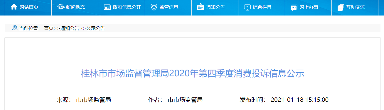 中國質(zhì)量新聞網(wǎng)訊 2021年1月18日,廣西桂林市市場監(jiān)督管理局網(wǎng)站公示2020年第四季度消費投訴信息。