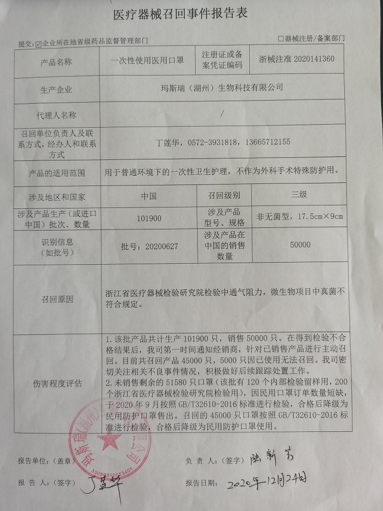 瑪斯瑞(湖州)生物科技有限公司報(bào)告,由于2020年浙江省級(jí)醫(yī)療器械監(jiān)督抽檢中其生產(chǎn)的一次性使用醫(yī)用口罩經(jīng)浙江省醫(yī)療器械檢驗(yàn)研究院檢驗(yàn)存在通氣阻力、微生物項(xiàng)目中真菌不符合要求,該公司對其生產(chǎn)的一次性使用醫(yī)用口罩(注冊證號(hào):浙械注準(zhǔn)2020141360)主動(dòng)召回。召回級(jí)別為三級(jí)。涉及產(chǎn)品的型號(hào)、規(guī)格及批次等詳細(xì)信息見《醫(yī)療器械召回事件報(bào)告表》。