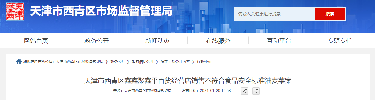 天津市西青區(qū)鑫鑫聚鑫平百貨經(jīng)營店銷售不符合食品安全標(biāo)準(zhǔn)油麥菜案 | 天津市西青區(qū)鑫鑫聚鑫平百貨經(jīng)營店 | 92120111MA06T1N42W | —— | 李洪杰 | 津 | 當(dāng)事人購進(jìn)韭菜時未查驗供貨商營業(yè)執(zhí)照、合格證明、產(chǎn)地證明等相關(guān)證明文件且銷售的油麥菜計量稱重,經(jīng)抽樣檢驗,氟蟲腈項目不符合GB2763-2019《食品安全國家標(biāo)準(zhǔn) 食品中農(nóng)藥最大殘留限量》要求,檢驗結(jié)論不合格(標(biāo)準(zhǔn)要求:≤0.02mg/kg,實測結(jié)果:0.091mg/kg) | 1.警告;2、沒收違法所得5.22元;3.處5000元罰款。 | 《中華人民共和國食品安全法》第一百二十六條第一款、《中華人民共和國食品安全法》第一百二十四條第一款 | 主動履行,15日 | 天津市西青區(qū)市場監(jiān)督管理局 | 20210118 |