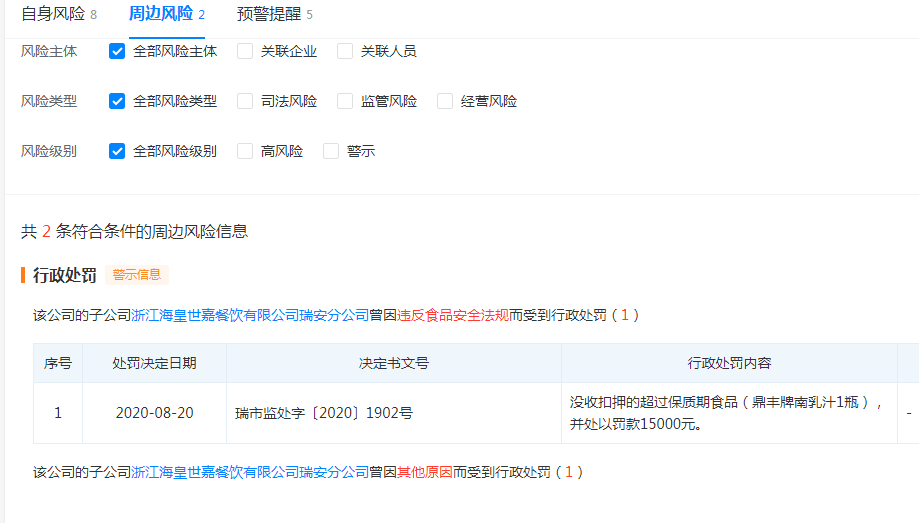 此外,該公司的子公司浙江?;适兰尾惋嬘邢薰救鸢卜止具€曾因違反食品安全法規(guī)而受到行政處罰。瑞市監(jiān)處字〔2020〕1902號顯示,對?;适兰尾惋嬘邢薰救鸢卜止緵]收扣押的超過保質期食品(鼎豐牌南乳汁1瓶),并處以罰款15000元。處罰決定日期為2020年8月20日。