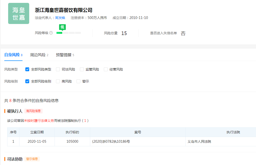 公開資料顯示,浙江?;适兰尾惋嬘邢薰境闪⒂?010年11月10日,注冊資本500萬元人民幣。法定代表人周發(fā)煥。經營范圍包括餐飲服務:大型餐館:(單純火鍋;含涼菜;不含裱花蛋糕;不含生食海產品);餐廳。