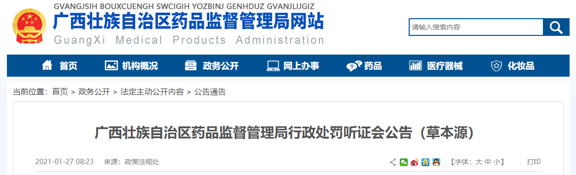 經(jīng)調(diào)查取證,廣西草本源中藥飲片有限公司涉嫌生產(chǎn)銷售劣藥決明子(批號(hào):200101)一案,本機(jī)關(guān)擬依法對(duì)其作出行政處罰。根據(jù)當(dāng)事人的申請(qǐng),本機(jī)關(guān)依法決定對(duì)該行政處罰案件公開舉行聽證會(huì),現(xiàn)將有關(guān)事項(xiàng)公告如下:
