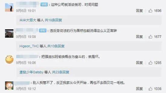 這番言語一石激起千層浪。有網(wǎng)友表示,“715”涉嫌違法,是赤裸裸的剝削;還有網(wǎng)友稱,違反勞動(dòng)法的行為居然也能說得這么義正辭嚴(yán)。即使有網(wǎng)友表示理解賈國龍的觀點(diǎn),認(rèn)為回報(bào)和付出成正比,但整體來看,批評(píng)賈國龍的聲浪明顯蓋過贊同聲音。