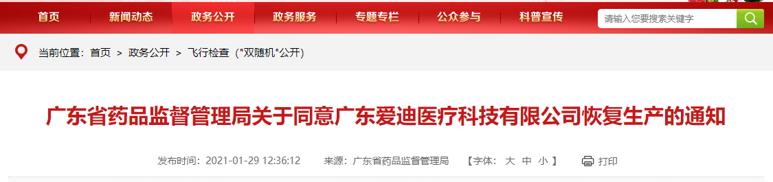 廣東省藥品監(jiān)督管理局關(guān)于同意廣東愛迪醫(yī)療科技有限公司恢復(fù)生產(chǎn)的通知