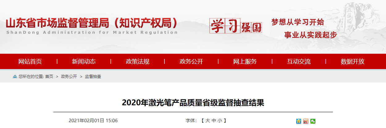 中國質(zhì)量新聞網(wǎng)訊 (記者 徐遠官) 2021年2月1日,山東省市場監(jiān)管局網(wǎng)站公布2020年激光筆產(chǎn)品質(zhì)量省級監(jiān)督抽查結(jié)果。本次共抽查了全省8家企業(yè)生產(chǎn)/銷售的10批次激光筆產(chǎn)品,發(fā)現(xiàn)8批次產(chǎn)品不符合相關(guān)標準的要求,不合格項目均為標記項目。