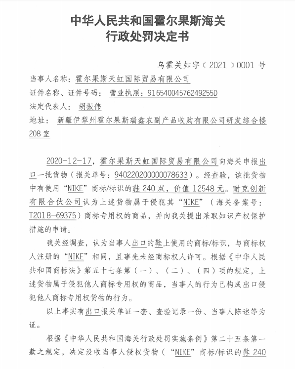 中國(guó)質(zhì)量新聞網(wǎng)訊 近日,霍爾果斯海關(guān)發(fā)布關(guān)于霍爾果斯天虹國(guó)際貿(mào)易有限公司出口貨物侵犯“NIKE”商標(biāo)專用權(quán)的行政處罰決定書(烏霍關(guān)知字〔2021〕0001號(hào))。