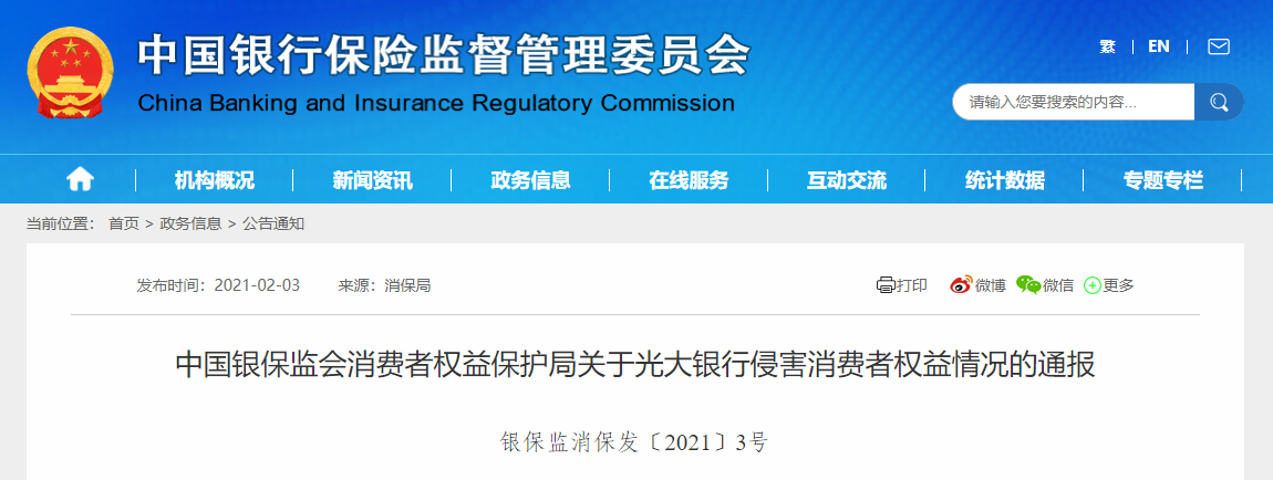 中國銀保監(jiān)會消費者權(quán)益保護局關(guān)于光大銀行侵害消費者權(quán)益情況的通報