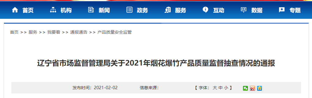 中國質量新聞網訊 (記者 徐遠官) 據遼寧省市場監(jiān)督管理局網站消息,元旦、春節(jié)前夕,遼寧省市場監(jiān)督管理局對省內煙花爆竹產品質量進行了監(jiān)督抽查。經檢驗,40家經銷單位的42批次煙花爆竹產品不合格,產品抽查不合格發(fā)現率為14%。