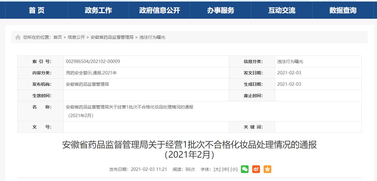 2021年1月26日,國家藥品監(jiān)督管理局公布了關(guān)于20批次不合格化妝品的通告,其中有安徽省經(jīng)營的1批次產(chǎn)品,現(xiàn)將相關(guān)處理結(jié)果通報(bào)如下: